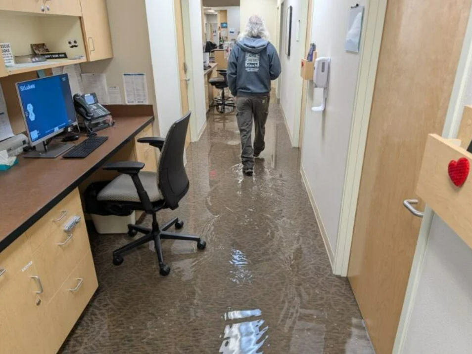 At 10:00PM on a Sunday night during a holiday weekend, a water main break flooded a large portion of the St. Luke’s Clinic in McCall. The facilities team acted quickly to shut off the water, but the damage was already extensive with 1.5in of standing water throughout the building.